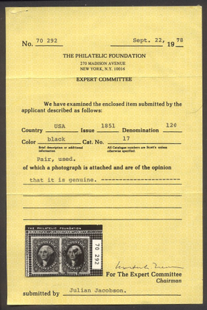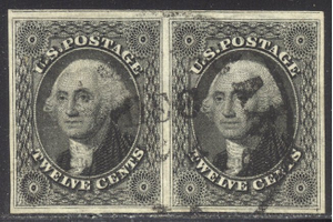 Scott #17: 12c Black, Imperf Centering & Condition: Used. Fresh. VF/XF and CHOICE Pair. A Foundation certificate accompanies. Reverse (Gum Side): N/A Faults / Imperfections: None The item pictured is the actual item you are purchasing, unless otherwise noted. I also offer an interest-free layaway plan. Ask me about it!" All items will be mailed a day or two after payment is received. --------------------------------------------------------------------------------