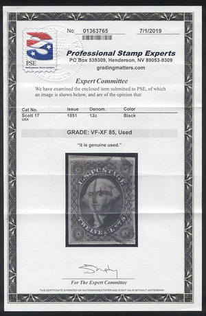 U.S. #17 CHOICE Used VF/XF w/ Cert - 12c Black, Imperf