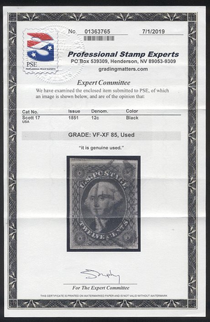 Scott #17: 12c Black, Imperf Centering & Condition: Used. Fresh. Sharp Impression. VF/XF and CHOICE with light town CDS. A Graded (85) PSE certificate accompanies. Reverse (Gum Side): N/A Faults / Imperfections: None The item pictured is the actual item you are purchasing, unless otherwise noted. I also offer an interest-free layaway plan. Ask me about it!" All items purchased will be mailed a day or two after payment is received. --------------------------------------------------------------------------------