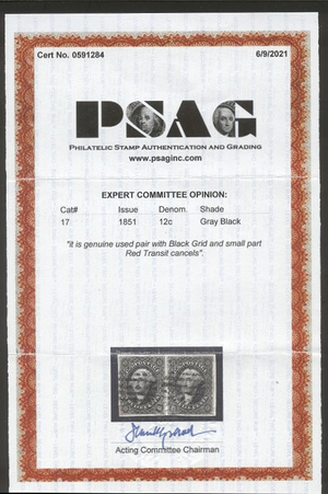 Scott #17: 12c Black, Imperf Centering & Condition: Used. Rich color. VF/XF and CHOICE! A PSAG Certificate accompanies (this was the right stamp). Reverse (Gum Side): N/A Faults / Imperfections: None The item pictured is the actual item you are purchasing, unless otherwise noted. I also offer an interest-free layaway plan. Ask me about it!" All items purchased will be mailed a day or two after payment is received. --------------------------------------------------------------------------------