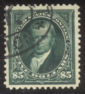Scott #278: 1895 $5.00 Marshall Centering & Condition: Used. Fresh. Rich color. VF/XF and CHOICE! A clear 2003 APEX Certificate accompanies. Reverse (Gum Side): N/A. Faults / Imperfections: None The item pictured is the actual item you are purchasing, unless otherwise noted. I also offer an interest-free layaway plan. Ask me about it!" All items purchased will be mailed a day or two after payment is received. --------------------------------------------------------------------------------