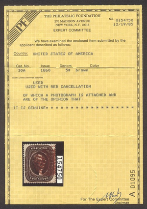Scott #30A: 5c Brown Centering & Condition: Used. Fresh. Rich Color. Extremely Fine and CHOICE with a Red cancel. Perfs actually CLEAR all around. A Foundation certificate accompanies. Reverse (Gum Side): N/A Faults / Imperfections: None The item pictured is the actual item you are purchasing, unless otherwise noted. I also offer an interest-free layaway plan. Ask me about it!" All items purchased will be mailed a day or two after payment is received. --------------------------------------------------------------------------------