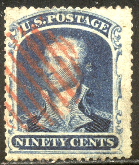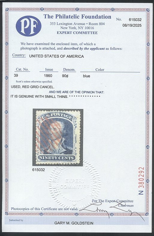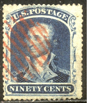 Scott #39: 90c Blue Centering & Condition: Used. Fine and RARE with a red grid cancel. A Foundation certificate accompanies. The catalog value is $10,000 and even with the tiny thins my price is quite reasonable. Reverse (Gum Side): N/A Faults / Imperfections: There are several tiny thins as typically found on these. The item pictured is the actual item you are purchasing, unless otherwise noted. I also offer an interest-free layaway plan. Ask me about it!" All items purchased will be mailed a day or two after payment is received. --------------------------------------------------------------------------------