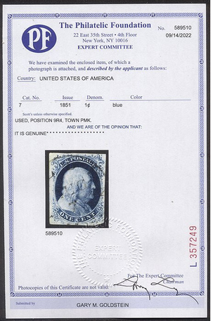 Scott #7: 1c Blue, Type IV Plate 4 Centering & Condition: Used. Rich color. Very Fine example of the SCARCE Type II from Plate 4. This is position 9R4. A Foundation certificate accompanies.. Reverse (Gum Side): N/A Faults / Imperfections: None The item pictured is the actual item you are purchasing, unless otherwise noted. I also offer an interest-free layaway plan. Ask me about it!" All items purchased will be mailed a day or two after payment is received. --------------------------------------------------------------------------------