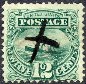 This is the 1869 Pictorial Issue featuring the steamship design. Denomination is 12 cents in green. Stamp includes the original grill impression on the reverse.