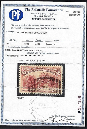 WCstamps: U.S. Scott #242 $2 Columbian XF/S Used 2022 PF Cert Grade95 SMQ $3,500