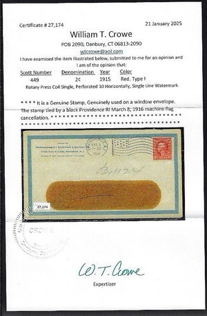 WCstamps: U.S. Scott #449 2c Type I On Cover VF Used 2025 Crowe Cert CV $1,500