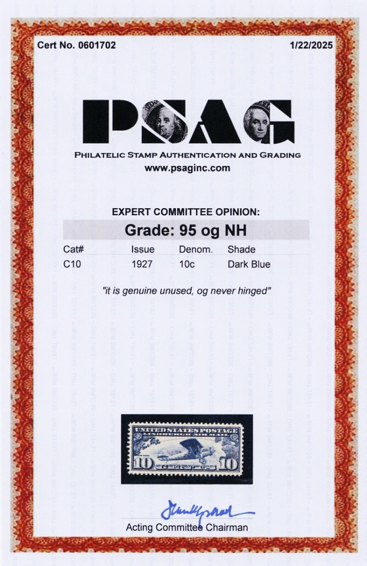 C10, Mint XF NH 10¢ With Graded 95 PSAG Certificate * Stuart Katz