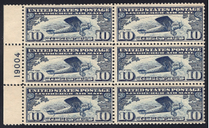 Scott #C10 VF MNH LEFT Plate Block of six of the10¢ Airmail issue commemorating Lindbergh's solo flight of the Atlantic-Great centering for this early airmail favorite.