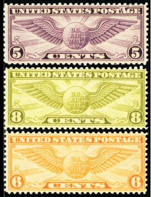 C16, C17 & C19, 1931-34 Winged Globe Set of Three Airmail Stamps