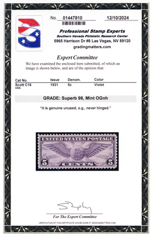 C16, Mint Superb NH 5¢ - With Graded 98 PSE Cert - Stuart Katz