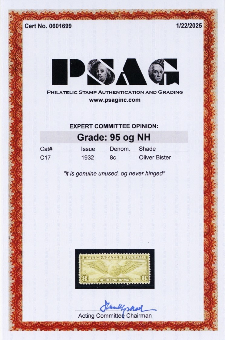 C17, Mint Superb NH 8¢ With Graded 98 PSAG Certificate -*- Stuart Katz