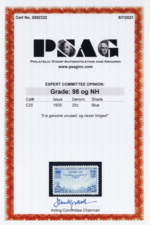 C20, Mint NH Superb 25¢ With PSAG Graded 98 Certificate -- Stuart Katz