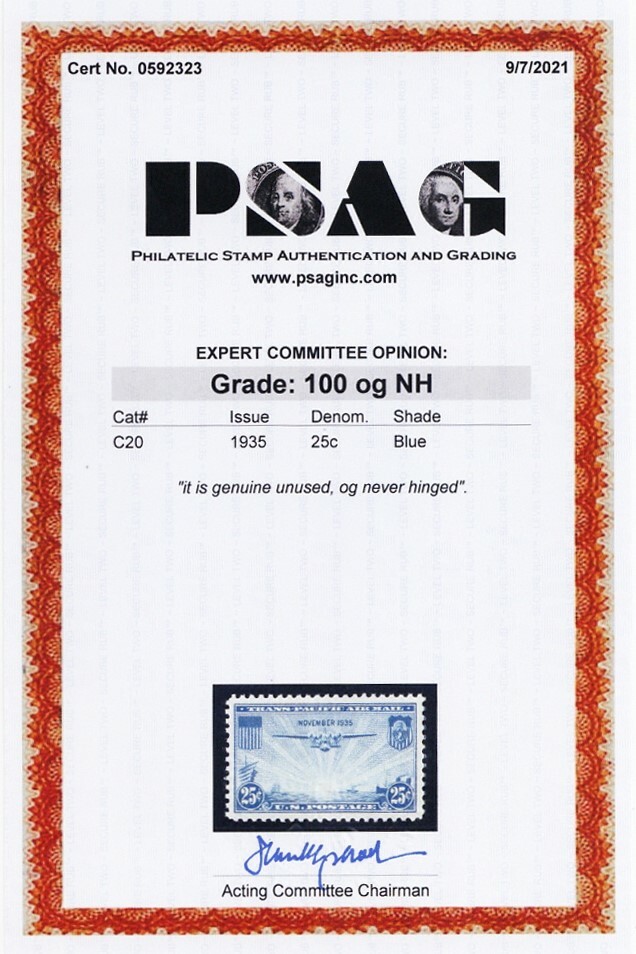 C20, Mint NH Superb GEM 25¢ With PSAG Graded 100 Certificate - Stuart Katz