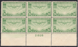 | C21 F-VF MNH OG AIRMAIL--20¢ CHINA CLIPPER PLATE BLOCK OF 6 Scott #C21 20¢ Trans-Pacific Airmail issue Plate Block of 6 in F-VF MNH OG condition. A great Plate block from a very popular early US Airmail Series that was used for sending mail to destinations across the Pacific Ocean. Buy it now for your collection