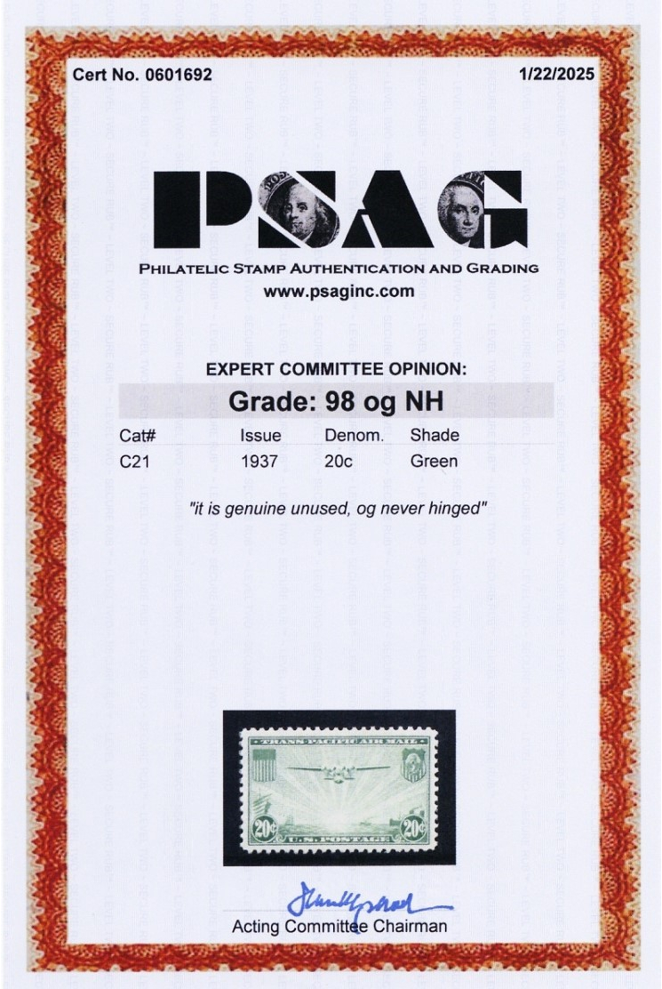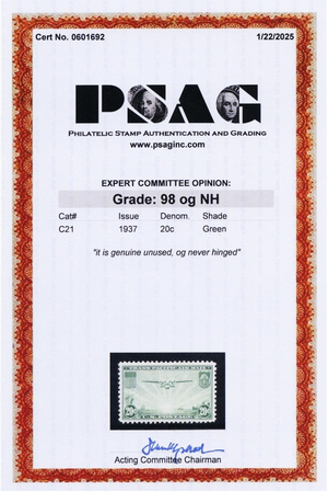 C21, Mint Superb NH 20¢ With Graded 98 PSAG Certificate ** Stuart Katz