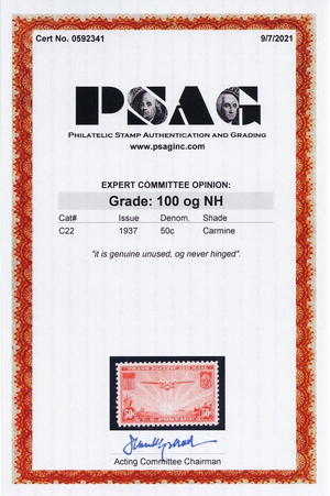C22, Mint NH Superb GEM 50¢ With PSAG Graded 100 Certificate - Stuart Katz