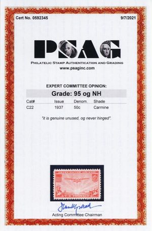 Due to the high cost of obtaining certificates we will only refund the cost of the stamp and not the cost of the certificate for stamps that sell for less than $250 that come back with a negative certificate. Stamps that sell for above $250 will receive a full refund for both the price of the stamp and cost of the certificate if it should come back not as described. For U.S. stamps only certificates from either APS, PSE or from the Philatelic Foundation are accepted, however "graded" certificates or "encased" items are not accepted.