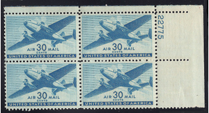 C30 WWII 30c Transport Plane Airmail UR Plate Block-VF MNH OG