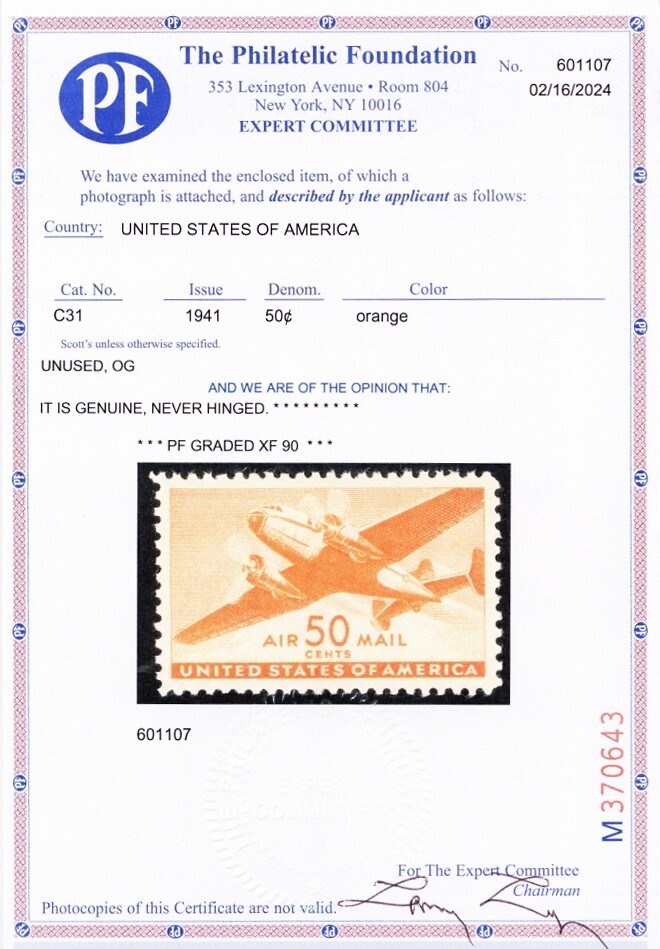 C31, Mint XF NH 50¢ - PFC Graded 90 - Stuart Katz