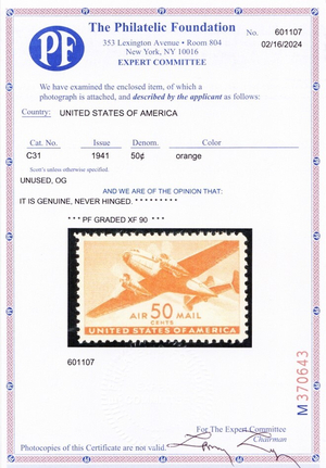 Due to the high cost of obtaining certificates we will only refund the cost of the stamp and not the cost of the certificate for stamps that sell for less than $250 that come back with a negative certificate. Stamps that sell for above $250 will receive a full refund for both the price of the stamp and cost of the certificate if it should come back not as described. For U.S. stamps only certificates from either APS, PSE or from the Philatelic Foundation are accepted, however "graded" certificates or "encased" items are not accepted.