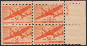 C31 WWII 50c Transport Plane Airmail UR Plate Block-VF MNH OG