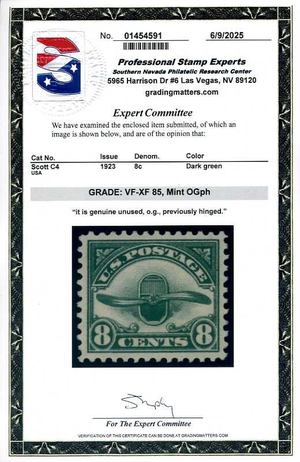 C4, 8¢ Airmail, Mint LH, PSE Graded VF-XF 85 Certificate, SMQ $25