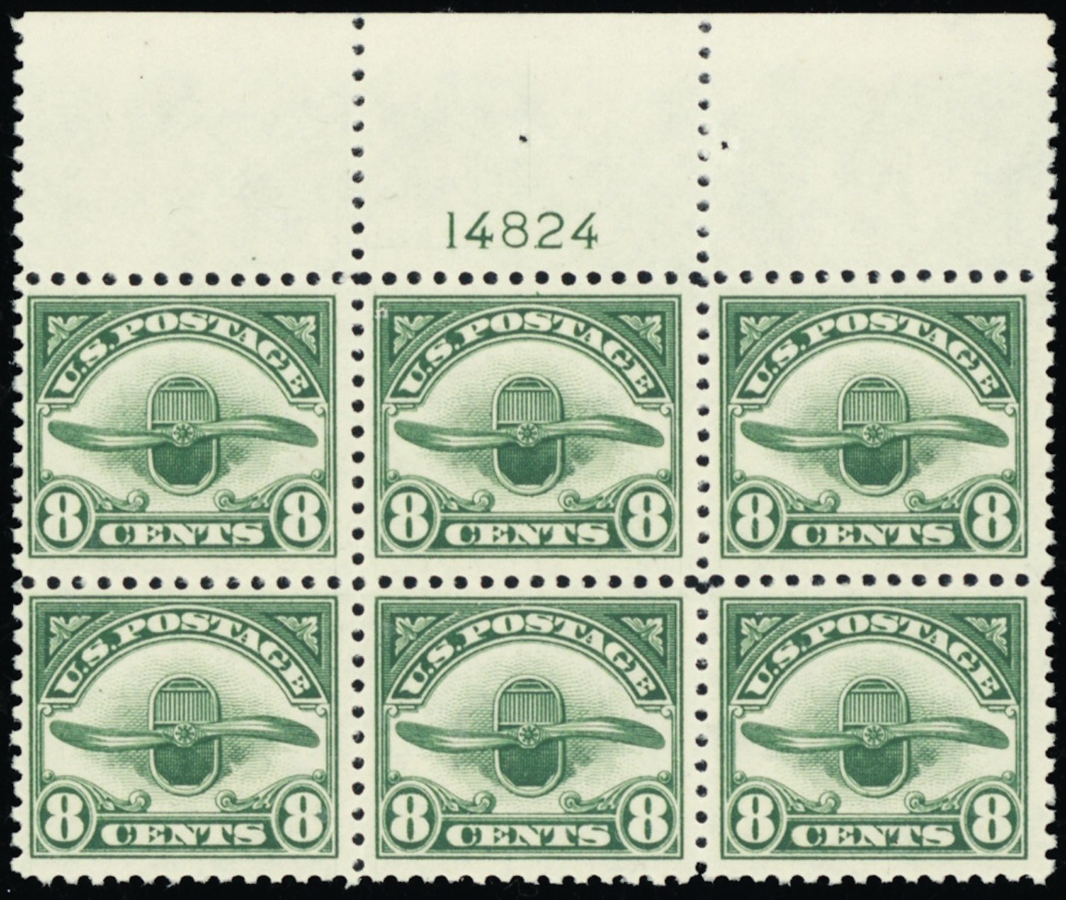 C4, Mint VF NH 8¢ Top Plate Block of Six - Stuart Katz