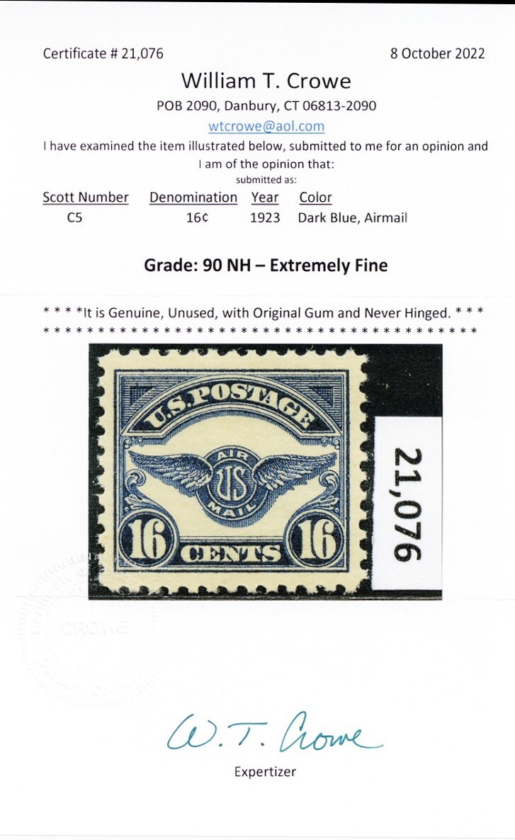 C5, Mint XF NH 16¢ - With Graded 90 Certificate - Stuart Katz