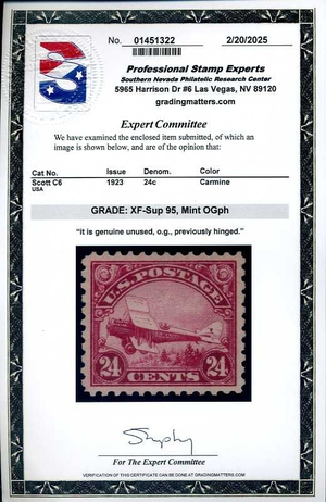 C6, 24¢ Biplane, PSE Graded XF-Sup 95 VLH Certificate, SMQ $160