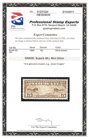 C8, Mint Superb NH 15¢ - With Graded 98J JUMBO PSE Certificate * Stuart Katz Description: