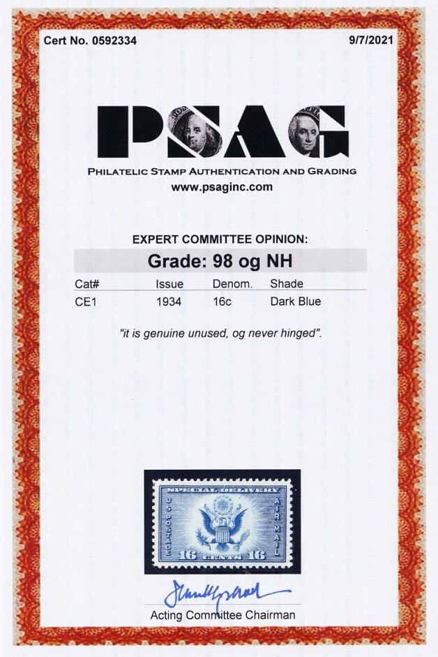 CE1, Mint NH Superb 16¢ With PSAG Graded 98 Certificate *-* Stuart Katz