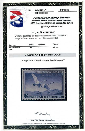 RW17, 1950 Duck Stamp, Mint LH, PSE Graded XF-Sup 95 Certificate, SMQ $
