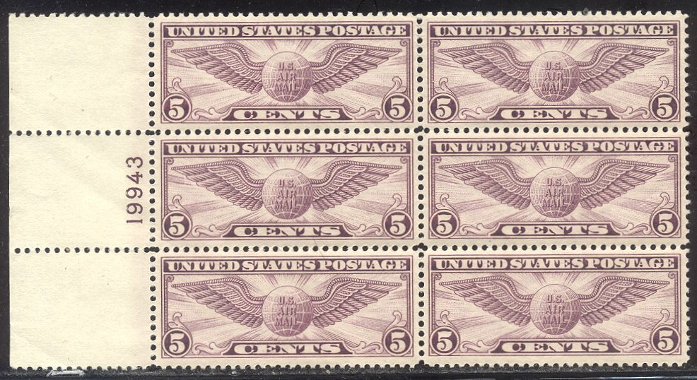 Scott #C12: 1930 5c Wings and Globe Centering & Condition: Mint. Fresh. Extremely Fine and CHOICE Plate Block. Reverse (Gum Side): Original gum. Never Hinged. Faults / Imperfections: None The item pictured is the actual item you are purchasing, unless otherwise noted. I also offer an interest-free layaway plan. Ask me about it!" All items will be mailed a day or two after payment is received. -------------------------------------------------------------------------------- Please click any of the following to read: |