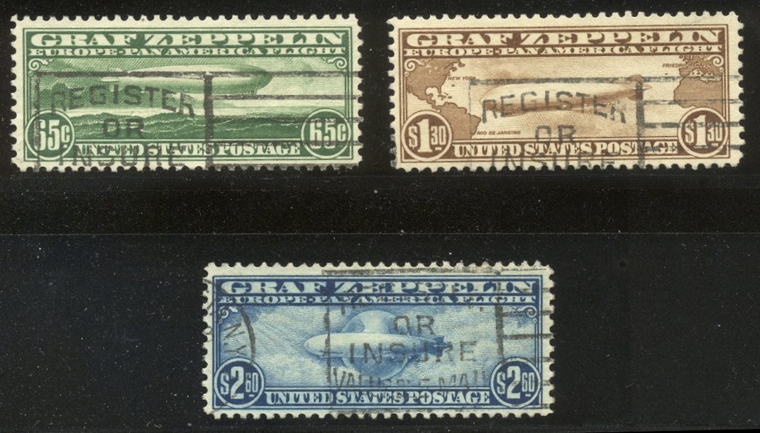 Scott #C13-15: 1930 Graf Zeppelin Set Centering & Condition: Used. Very Fine set with Matching Cancels. Reverse (Gum Side): N/A Faults / Imperfections: None The item pictured is the actual item you are purchasing, unless otherwise noted. I also offer an interest-free layaway plan. Ask me about it!" All items will be mailed a day or two after payment is received. ![]() ![]() ![]() --------------------------------------------------------------------------------