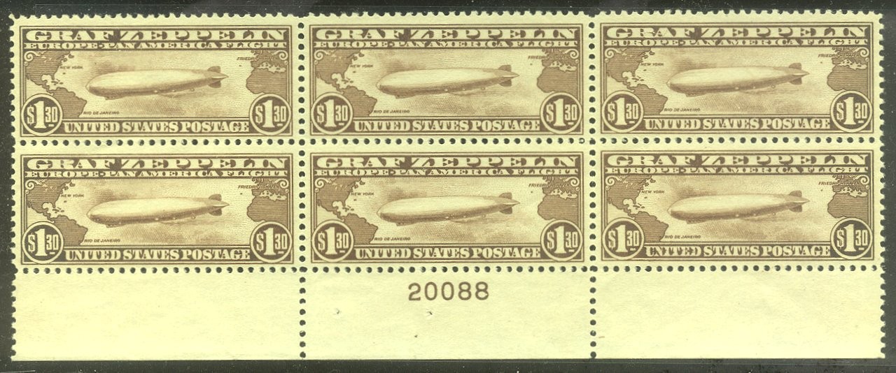 Scott #C14: 1930 $1.30 Graf Zeppelin Centering & Condition: Mint. Fresh. VF/XF and CHOICE Bottom Plate Block. Reverse (Gum Side): Original gum. Never Hinged. Couple of light gum bends. Faults / Imperfections: None The item pictured is the actual item you are purchasing, unless otherwise noted. I also offer an interest-free layaway plan. Ask me about it!" All items will be mailed a day or two after payment is received. ![]() ![]() ![]() --------------------------------------------------------------------------------