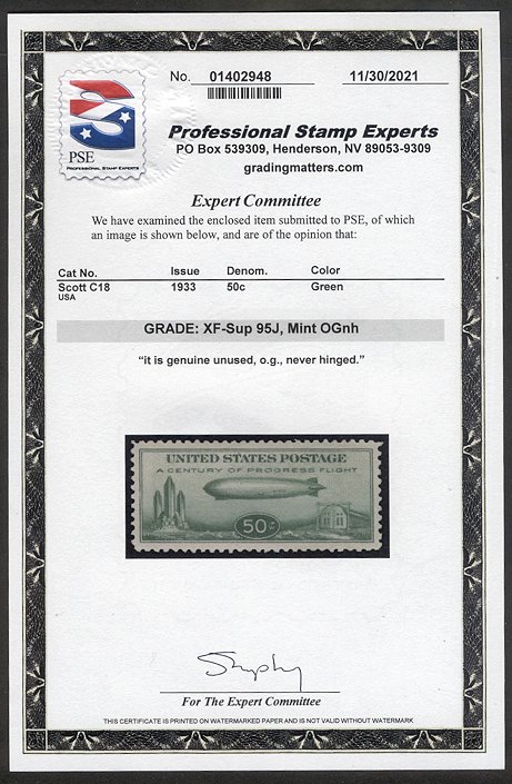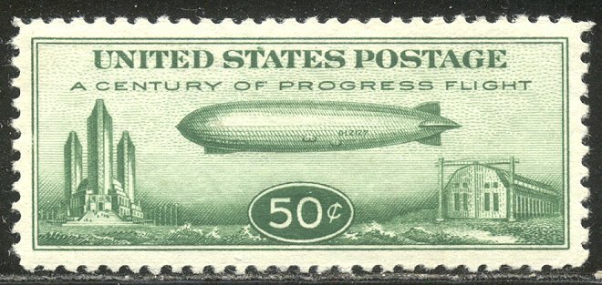 Scott #C18: 1933 50c Zeppelin Centering & Condition: Mint. Fresh. XF/SUP and CHOICE JUMBO. Reverse (Gum Side): Original gum. Never Hinged. Faults / Imperfections: None The item pictured is the actual item you are purchasing, unless otherwise noted. I also offer an interest-free layaway plan. Ask me about it!" All items will be mailed a day or two after payment is received. ![]() ![]() ![]() --------------------------------------------------------------------------------