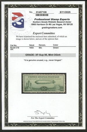 Scott #C18: 1933 50c Graf Zeppelin Centering & Condition: Mint. Fresh. XF/SUP and CHOICE. A Graded PSE Certificate accompanies. Reverse (Gum Side): Original gum. Never Hinged. Faults / Imperfections: None The item pictured is the actual item you are purchasing, unless otherwise noted. I also offer an interest-free layaway plan. Ask me about it!" All items will be mailed a day or two after payment is received. --------------------------------------------------------------------------------