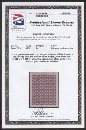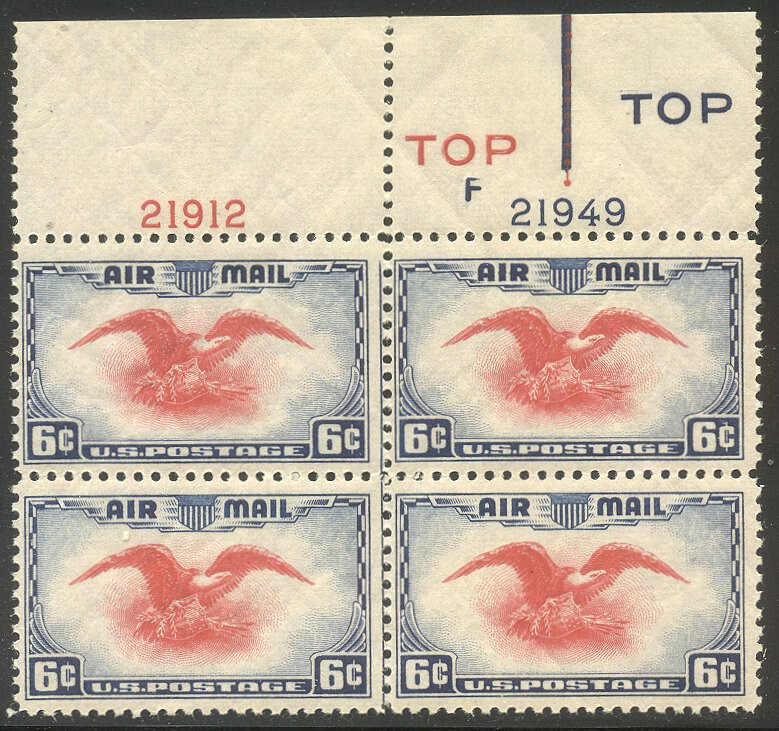 Scott #C23c: 1938 6c Eagle, Ultra & Carmine Centering & Condition: Mint. Fresh. Fine and RARE Plate Block (no more than 26 Reverse (Gum Side): Original gum. Never Hinged. Faults / Imperfections: None The item pictured is the actual item you are purchasing, unless otherwise noted. I also offer an interest-free layaway plan. Ask me about it!" All items will be mailed a day or two after payment is received. --------------------------------------------------------------------------------