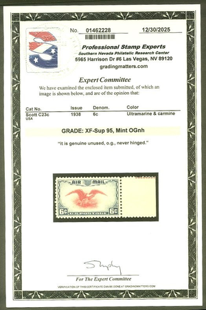 Scott #C23c: 1938 Ultra & Carmine Centering & Condition: Mint. Fresh. XF/SUP and CHOICE. A Graded PSE Certificate accompanies. Reverse (Gum Side): Original gum. Never Hinged. Faults / Imperfections: None The item pictured is the actual item you are purchasing, unless otherwise noted. I also offer an interest-free layaway plan. Ask me about it!" All items will be mailed a day or two after payment is received. --------------------------------------------------------------------------------