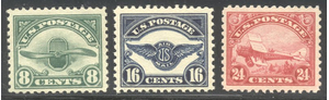 Scott #C4-6: 1923 Airmail Set Centering & Condition: Mint. Fresh. Very Fine set. Reverse (Gum Side): Original gum. Never Hinged. Faults / Imperfections: None The item pictured is the actual item you are purchasing, unless otherwise noted. I also offer an interest-free layaway plan. Ask me about it!" All items will be mailed a day or two after payment is received. --------------------------------------------------------------------------------