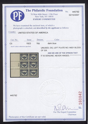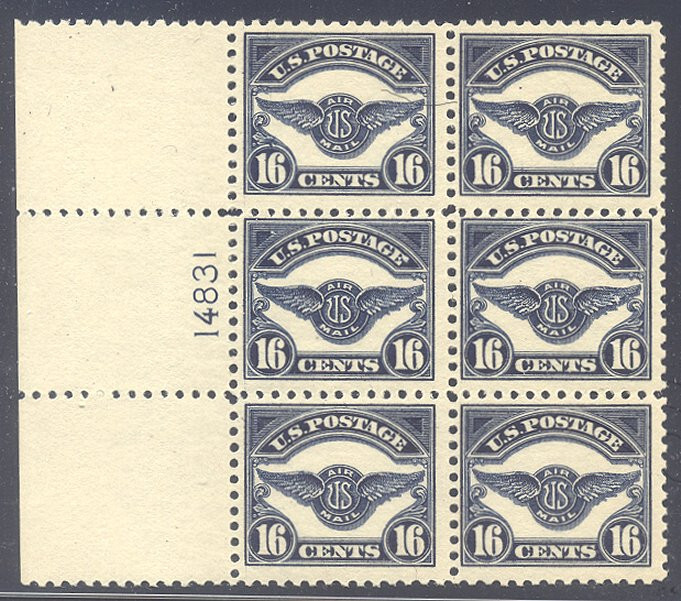 Scott #C5: 1923 16c Wings Centering & Condition: Mint. Fresh. Fine-Very Fine SCARCE Plate Block. Reverse (Gum Side): Original gum. Never Hinged. Faults / Imperfections: None The item pictured is the actual item you are purchasing, unless otherwise noted. I also offer an interest-free layaway plan. Ask me about it!" All items will be mailed a day or two after payment is received. --------------------------------------------------------------------------------