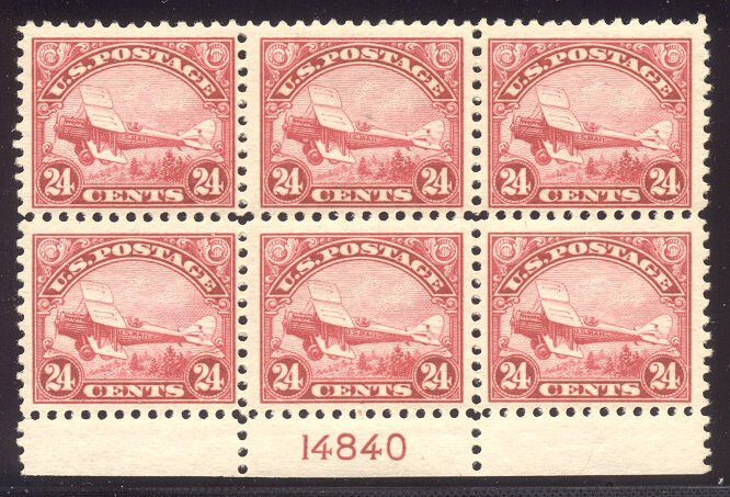 Scott #C6: 1923 24c DeHavilland Centering & Condition: Mint. Fresh. Fine-Very Fine and SCARCE Plate Block. Reverse (Gum Side): Original gum. Never Hinged. Faults / Imperfections: None The item pictured is the actual item you are purchasing, unless otherwise noted. I also offer an interest-free layaway plan. Ask me about it!" All items will be mailed a day or two after payment is received. -------------------------------------------------------------------------------- Please click any of the following to read: |