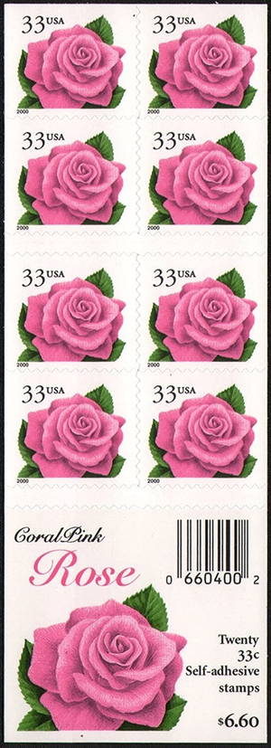 Coral Pink Rose Pane of Twenty 33 Cent Postage Stamps Scott 3052ef
