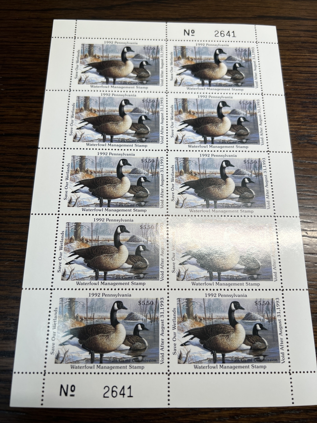 1992 Pennsylvania Waterfowl Management Stamp-MNH Block Of 10 Stamps With Plate #.