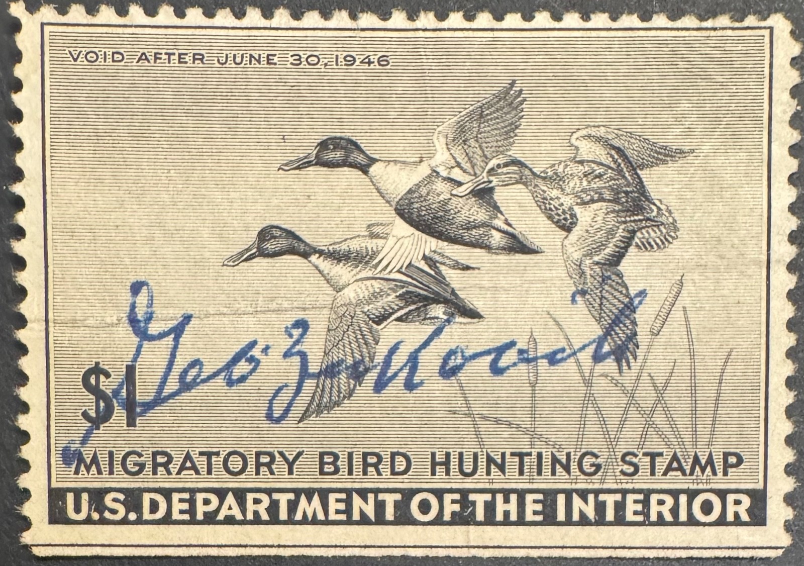 Original 1945–46 Federal Duck Stamp (RW12) featuring mallards in flight. Used example with required hunter signature. Strong color and intact perforations. Light crease on reverse. Genuine U.S. Interior issue.