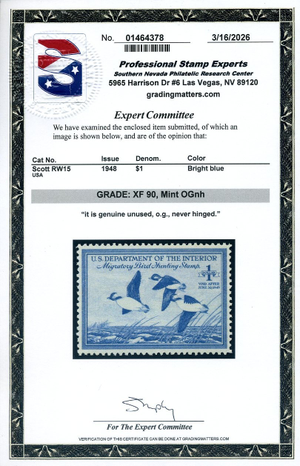 RW15, 1948 Duck Stamp, PSE Graded XF 90 Mint NH Certificate, SMQ $125