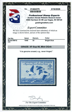 RW15, 1948 Duck Stamp, PSE Graded XF-Sup 95 Mint NH Certificate, SMQ $200