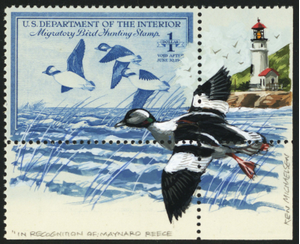The stamp was signed by the artist, Maynard Reece, and remarqued by Ken Michaelsen in recognition of Reece’s work. Reece himself no longer does remarques. Reece was a five-time winner of the federal stamp design, for the RW15, RW18, RW26, RW36, and RW38 stamps.