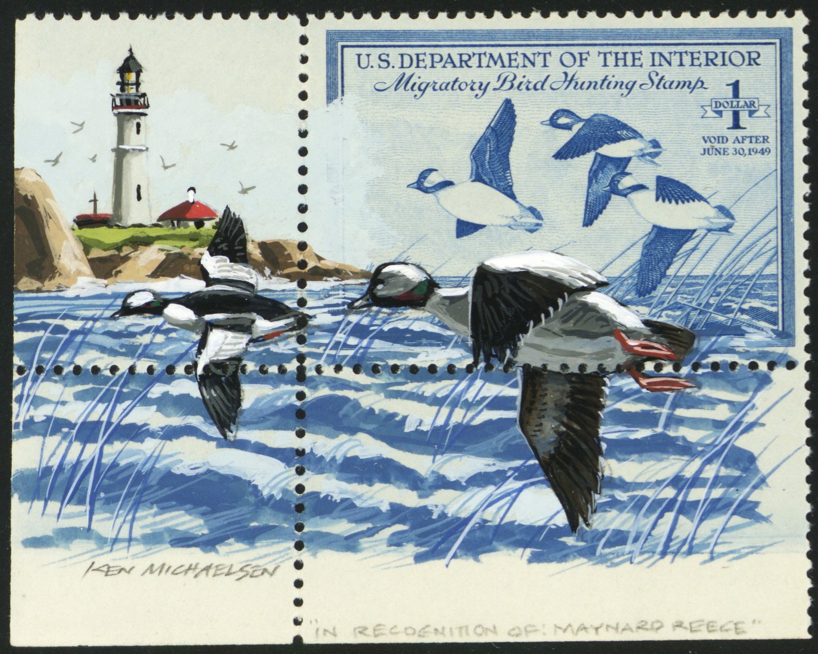 The stamp was signed by the artist, Maynard Reece, and remarqued by Ken Michaelsen in recognition of Reece’s work. Reece himself no longer does remarques. Reece was a five-time winner of the federal stamp design, for the RW15, RW18, RW26, RW36, and RW38 stamps.